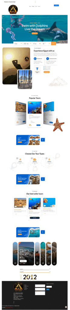 The website was structured to deliver an immersive first impression through a powerful hero section featuring “Swim with Dolphins – Live the Dream”, supported by clear call-to-action buttons and an easy trip-search layout that helps visitors explore tours faster.